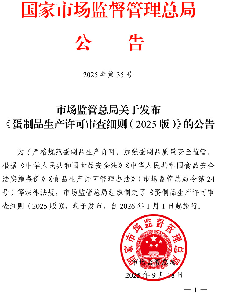 为了严格规范蛋制品生产许可,加强蛋制品质量安全监管,根据《中华人民共和国食品安全法》《中华人民共和国食品安全法实施条例》《食品生产许可管理办法》(市场监管总局令第24号)等法律法规,市场监管总局组织制定了《蛋制品生产许可审查细则(2025版)》,现予发布,自2026年1月1日起施行。