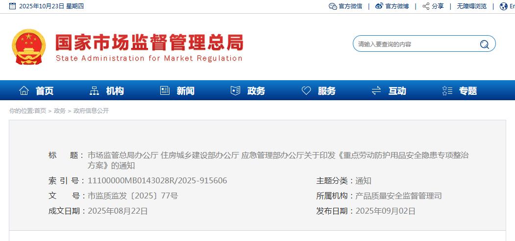 市场监管总局办公厅住房城乡建设部办公厅应急管理部办公厅关于印发《重点劳动防护用品安全隐患专项整治方案》的通知