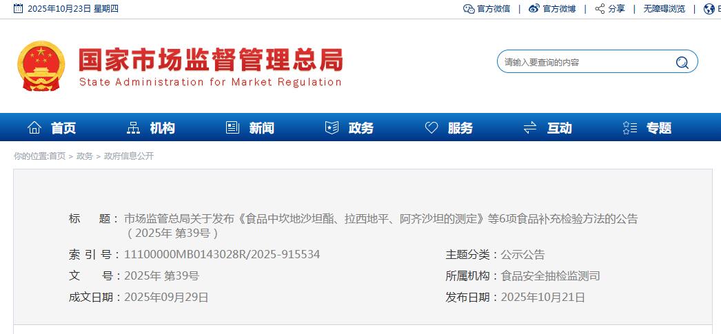 根据《中华人民共和国食品安全法实施条例》有关规定,市场监管总局批准发布《食品中坎地沙坦酯、拉西地平、阿齐沙坦的测定》等6项食品补充检验方法。名称和编号如下: