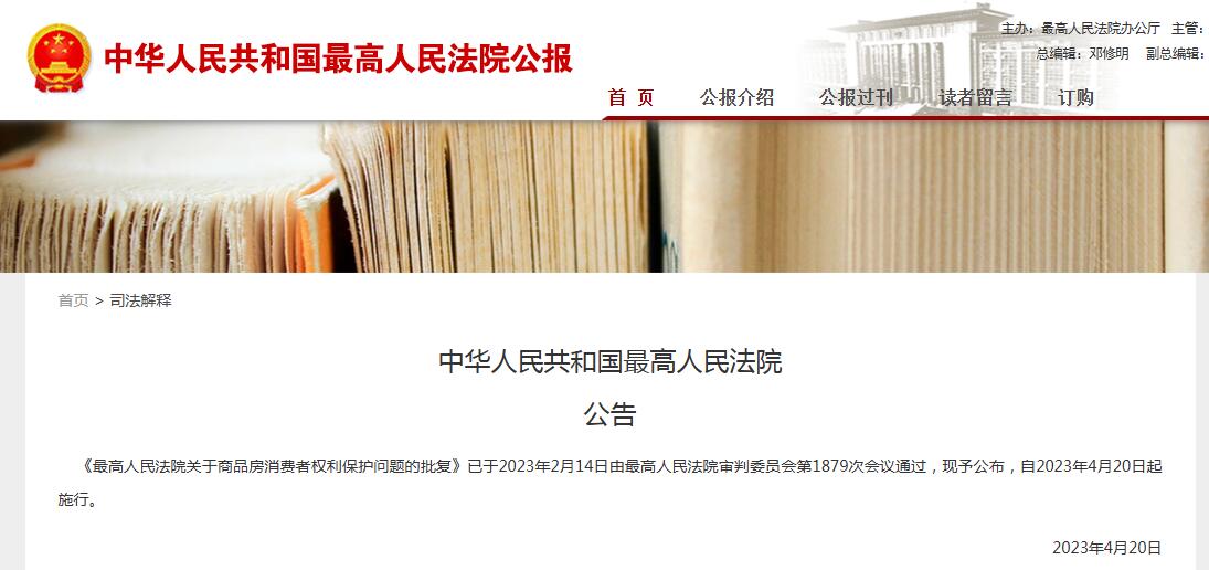 《最高人民法院关于商品房消费者权利保护问题的批复》已于2023年2月14日由最高人民法院审判委员会第1879次会议通过,现予公布,自2023年4月20日起施行。