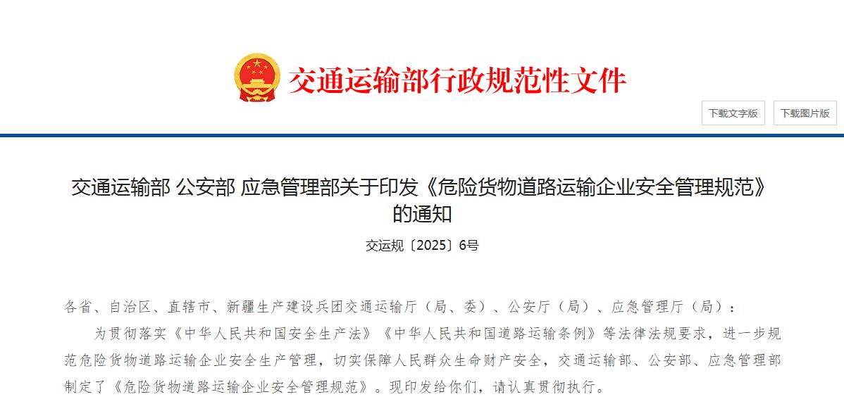 为贯彻落实《中华人民共和国安全生产法》《中华人民共和国道路运输条例》等法律法规要求,进一步规范危险货物道路运输企业安全生产管理,切实保障人民群众生命财产安全,交通运输部、公安部、应急管理部制定了《危险货物道路运输企业安全管理规范》。现印发给你们,请认真贯彻执行。