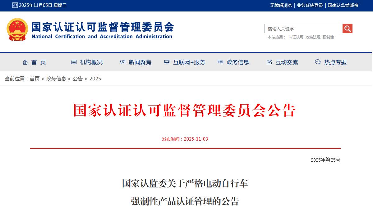 根据《中华人民共和国认证认可条例》和《工业和信息化部 公安部 市场监管总局 国家消防救援局关于强化电动自行车强制性国家标准实施 加快新产品供应的意见》(工信部联消费〔2025〕144号)关于“2025年8月31日及之前出厂或者进口的不符合《电动自行车安全技术规范》(GB17761—2024)但符合旧版本标准的产品可以销售至2025年11月30日”的要求,为严格电动自行车强制性产品认证(CCC认证)管理,现将有关事项公告如下: