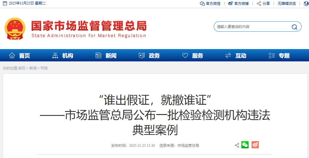为坚决维护检验检测行业公信力,切实保护消费者合法权益,各级市场监管部门持续保持监管高压态势,以铁腕手段严厉打击检测造假、骗取资质等严重违法违规行为,依法撤销了一批违法机构的检验检测资质。现选取部分典型案例予以公布。
