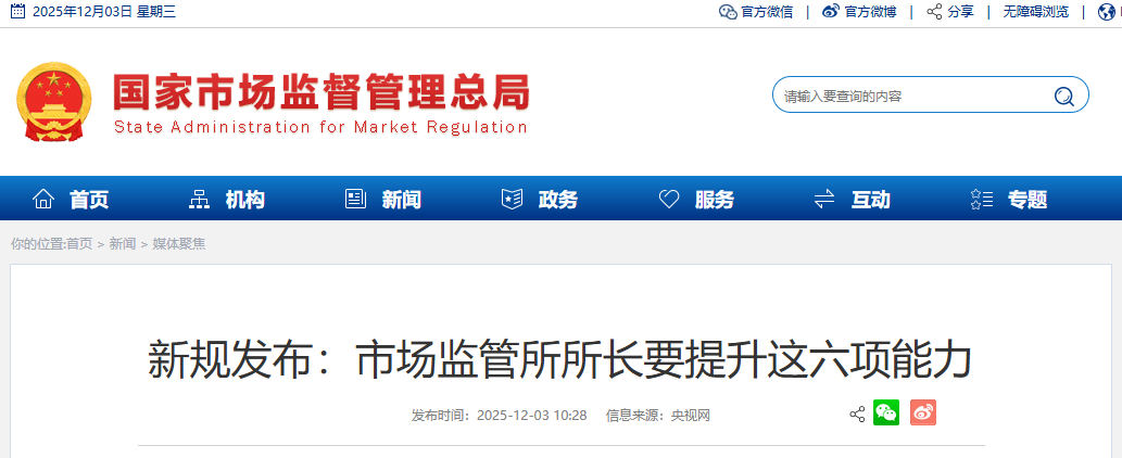 据“市说新语”微信公众号消息,日前,市场监管总局印发《关于加强市场监督管理所所长能力建设的指导意见》(以下简称《指导意见》),对提升市场监管所所长履职能力水平提出明确要求,进一步强化市场监管领域基层治理能力。