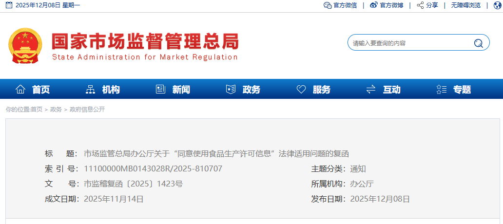 《广东省市场监督管理局关于同意使用食品生产许可证信息法律适用问题的请示》(粤市监〔2025〕54号)收悉。经研究,现函复如下: