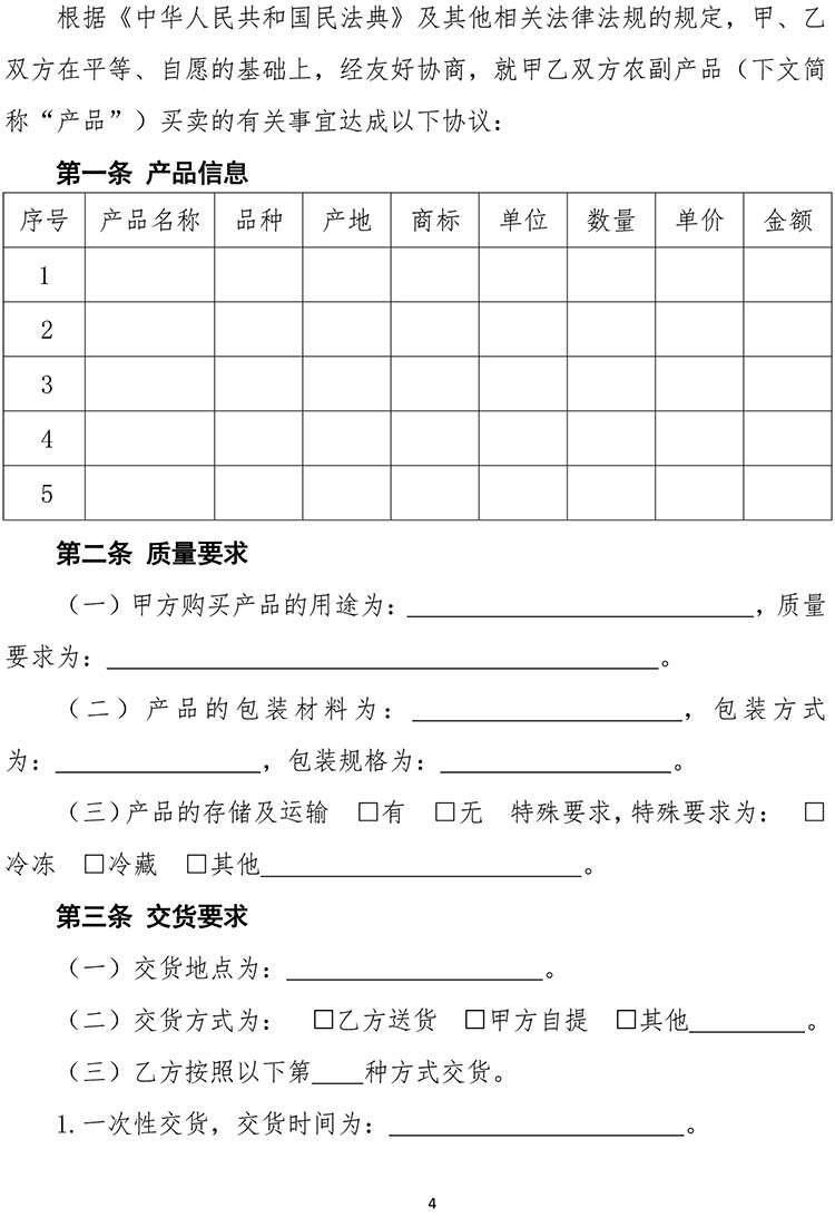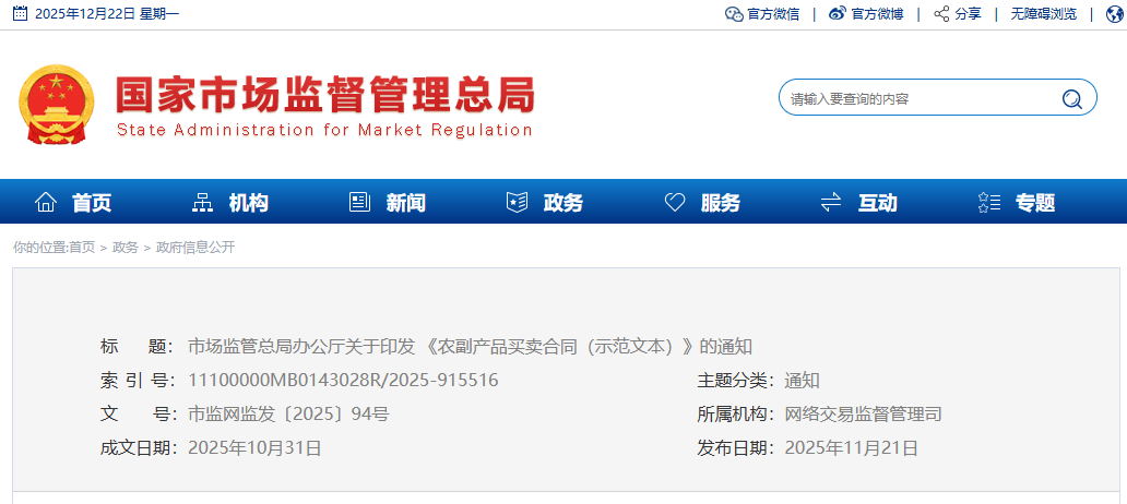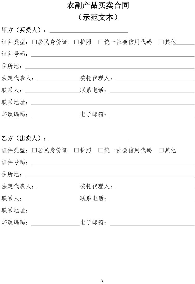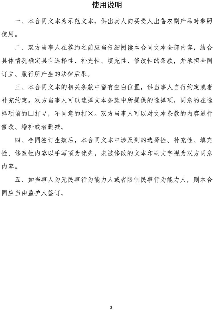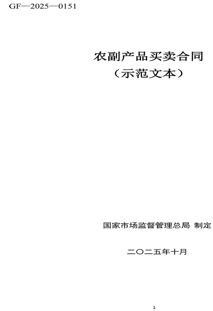 为落实《中华人民共和国民法典》有关规定,提升合同示范文本的专业性和规范性,市场监管总局对原工商总局制定的《农副产品买卖合同(示范文本)》(GF—2000—0151)进行了修订。现将修订后的《农副产品买卖合同(示范文本)》(GF—2025—0151)印发给你们,供社会公众参照使用,请积极做好示范文本的推行工作。原合同示范文本(GF—2000—0151)同时废止。