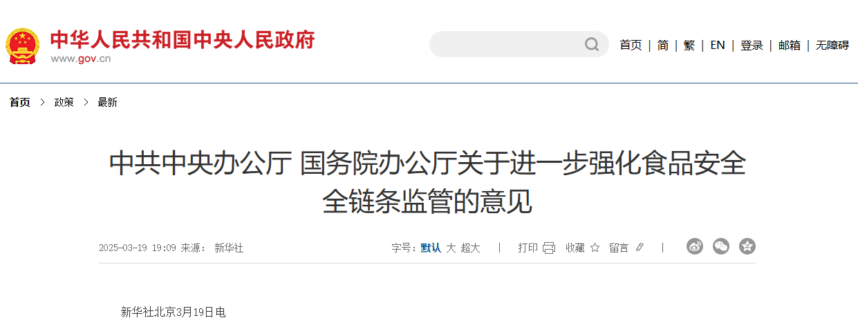 为进一步理清食品安全监管责任,建立健全协同监管机制,强化全链条监管合力,坚决守牢食品安全底线,切实保障人民群众身体健康和生命安全,经党中央、国务院同意,现提出如下意见。