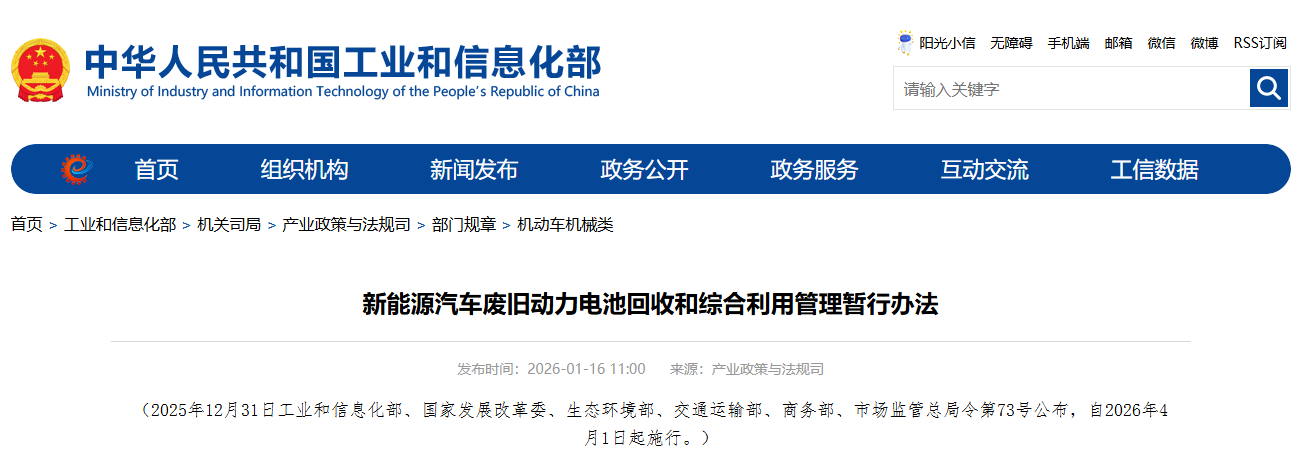 第五十条本办法自2026年4月1日起施行。《新能源汽车动力蓄电池回收利用管理暂行办法》(工信部联节〔2018〕43号)、《新能源汽车动力蓄电池回收利用溯源管理暂行规定》(工业和信息化部公告2018年第35号)、《新能源汽车动力蓄电池回收服务网点建设和运营指南》(工业和信息化部公告2019年第46号)、《新能源汽车动力蓄电池梯次利用管理办法》(工信部联节〔2021〕114号)同时废止。