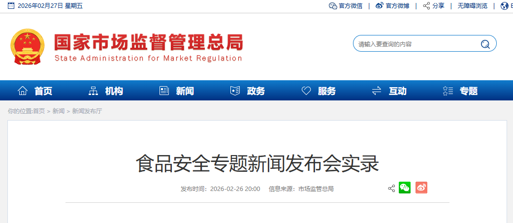 2月26日下午,市场监管总局召开食品安全专题新闻发布会。以下为发布会文字实录: