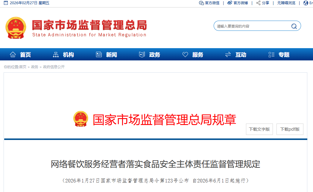 第四十八条本规定自2026年6月1日起施行。2017年11月6日原国家食品药品监督管理总局令第36号公布的《网络餐饮服务食品安全监督管理办法》同时废止。