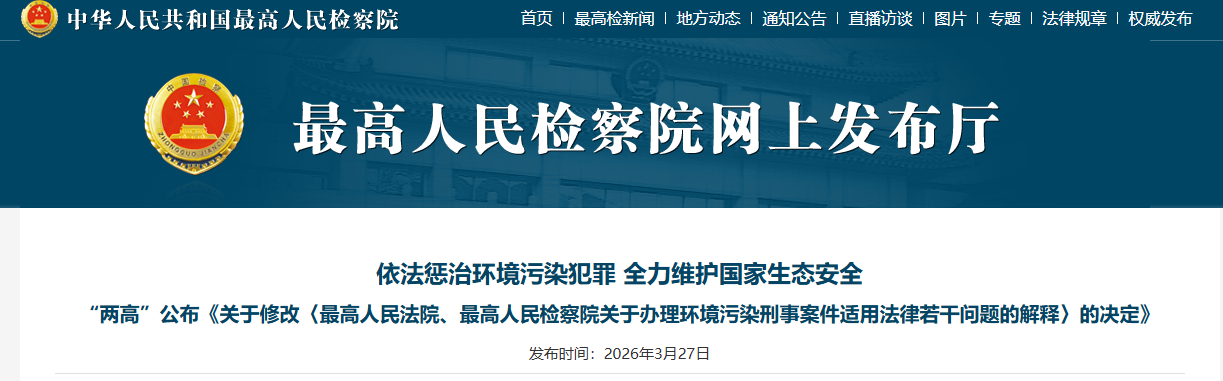 2026年3月27日,最高人民法院、最高人民检察院公布《关于修改〈最高人民法院、最高人民检察院关于办理环境污染刑事案件适用法律若干问题的解释〉的决定》(以下简称《修改决定》)。《修改决定》于2026年1月21日经最高人民法院审判委员会第1966次会议、于2026年2月6日经最高人民检察院第十四届检察委员会第七十次会议审议通过,自2026年3月30日起施行。2026年是“十五五”开局之年,也是生态环境法典的颁布实施之年。发布《修改决定》是“两高”持续深入学习贯彻党的二十大和二十届历次全会精神,认真落实四中全会部署,全面贯彻习近平生态文明思想和习近平法治思想,严格实施生态环境法典,以法治力量护航生态文明建设的重要举措,对于依法惩治环境污染犯罪,保障公众健康和生态环境权益,助力推动绿色低碳发展,服务推进美丽中国建设,具有重要意义。