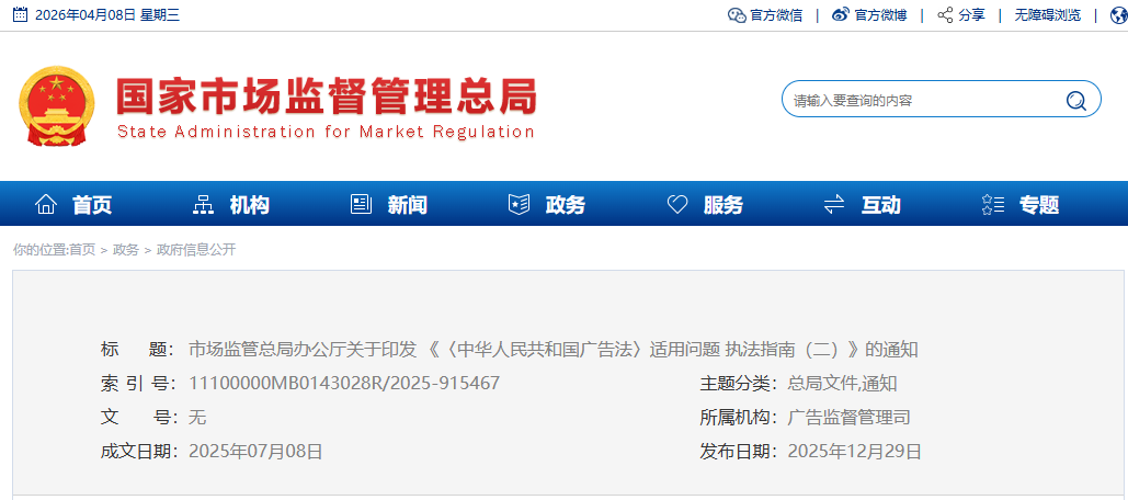 市场监管总局办公厅关于印发《〈中华人民共和国广告法〉适用问题执法指南(二)》的通知