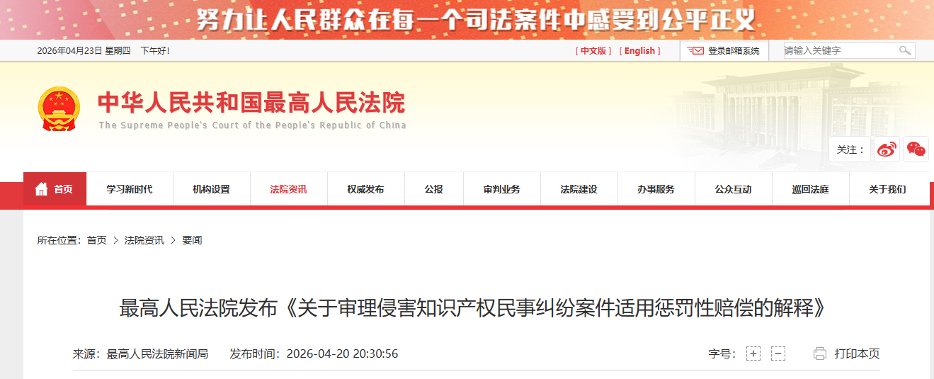 2026年4月20日,最高人民法院发布《最高人民法院关于审理侵害知识产权民事纠纷案件适用惩罚性赔偿的解释》(法释〔2026〕7号)。《解释》已经最高人民法院审判委员会第1972次会议通过,自2026年5月1日起施行。