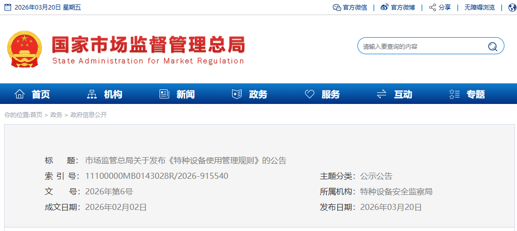为贯彻落实《特种设备使用单位落实使用安全主体责任监督管理规定》(国家市场监督管理总局令第74号),进一步加强特种设备使用单位监管,市场监管总局对《特种设备使用管理规则》(TSG08-2017)进行了修订,现予以发布,自2026年5月1日起施行。